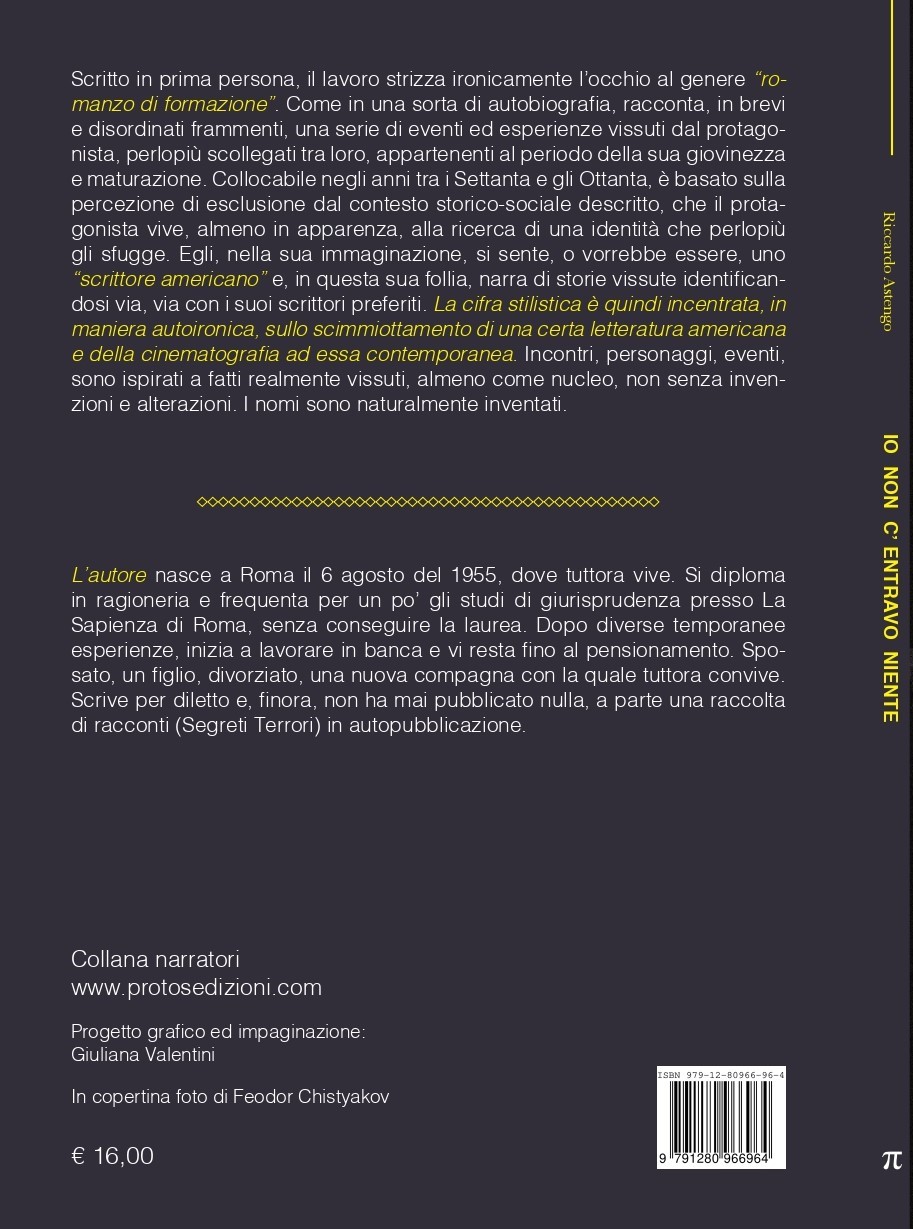 Scritto in prima persona, racconta in brevi e disordinati frammenti, una serie di eventi ed esperienze vissuti dal protagonista nel periodo della sua giovinezza e maturazione. Collocabile negli anni Settanta e Ottanta, è basato sulla percezione di esclusione dal contesto storico-sociale descritto, che il protagonista vive, almeno in apparenza, alla ricerca di una identità che tuttavia gli sfugge. Egli immagina di essere uno scrittore americano, dunque narra le storie vissute identificandosi con i suoi scrittori preferiti.