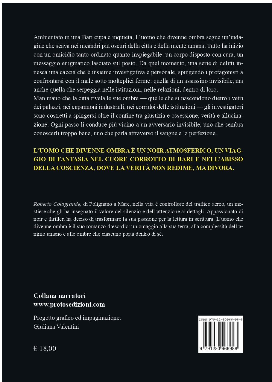 Ambientato in una Bari cupa e inquieta, L’Uomo che divenne ombra segue un’indagine che scava nei meandri più oscuri della città e della mente umana. Tutto ha inizio con un omicidio tanto ordinato quanto inspiegabile: un corpo disposto con cura, un messaggio enigmatico lasciato sul posto. Da quel momento, una serie di delitti innesca una caccia che è insieme investigativa e personale, spingendo i protagonisti a confrontarsi con il male sotto molteplici forme: quella di un assassino invisibile, ma anche quella che serpeggia nelle istituzioni, nelle relazioni, dentro di loro. A mano a mano che la città rivela le sue ombre, quelle che si nascondono dietro i vetri dei palazzi, nei capannoni industriali, nei corridoi delle istituzioni, gli investigatori sono costretti a spingersi oltre il confine tgra giustizia e ossessione, verità e allucinazione. Ogni passo li conduce più vicino a un avversario invisibile, uno che sembra conoscerli troppo bene, uno che parla attraverso il sangue e la perfezione.